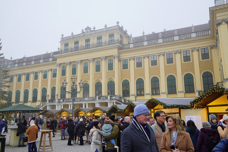 Das Schloss, Tourimagnet Nummer Eins in Österreich, ist gut bevölkert. Ich helfe einer jungen, portugiesischen Familie, ihre zehn Monate alte Tochter im Kinderwagen die Treppe hoch zu tragen. Fahrstuhl gibt es nicht in den heiligen Hallen. Der Protz geht mir an den Ohren und anderen Körperteilen vorbei. Stimmungsvoll sind die parkseitigen Außenansicht des Schlosses, das im.dichten Nebel verschwindet. Die Orangerie hat zu.