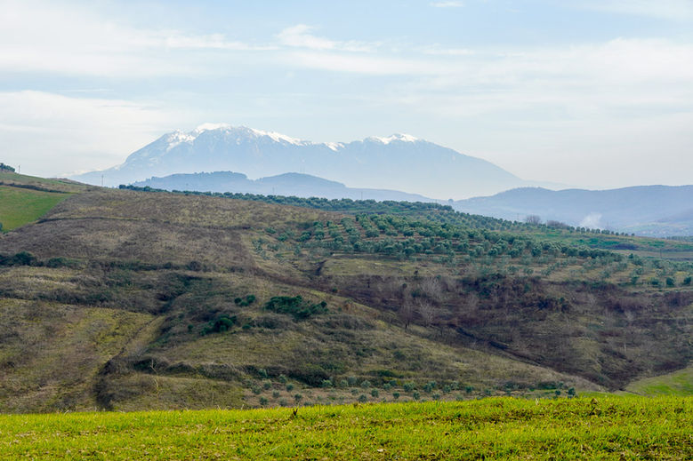 In Elbasan ist viel Bazaratmosphäre auf den Straßen. Gefällt mir gut. Der Verkehr nimmt immer mehr ab und hinter Belsh, nach 30 Kilometer, bin ich mal wieder so ziemlich alleine. Vereinzelt sind Pferdefuhrwerke oder auch Esel unterwegs. Die Landschaft ist hügelig und von winterlich brachliegenden Feldern und Olivenhainen geprägt. Ab und zu ein Weinberg. Im Osten leuchten die hohen Schneeberge. Es ist angenehm warm und ich fahre mit kurzer Hose. Eigentlich finde ich die Temperatur ideal, so um fünfzehn Grad. Wie soll das bloß werden bei 25, 35 oder gar 45 Grad? Na, ich werde sehen.