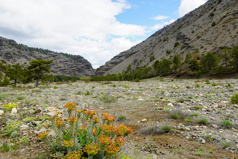 Am Ortsausgang endet der Asphalt. Die Straße ist geschottert, etwas grob, aber gut fahrbar. Leicht ansteigend. Und das bleibt im Wesentlichen so. Kleinere Passagen sind etwas matschig. Öfter mal muss ich den braunen Bach furten. Am anspruchsvollsten ist die engste Stelle der Schlucht. Straße und Bach teilen sich den Platz und ich muss das Rad etwa zehn Meter durch den Bach schieben, zwanzig bis dreißig Zentimeter tief ist das Wasser.