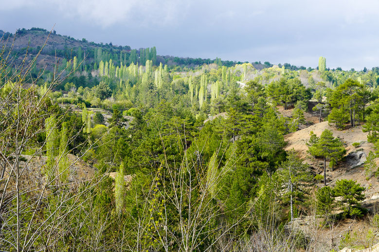 Es fängt an zu regnen und das nicht zu knapp. Nach über einer Stunde komme ich dann los und bleibe überraschenderweise trocken. Denn am Himmel sind viele schwarze Wolken. Es ist eine einsame Gegend. Durch Pinienwald geht es nochmal auf über 1.500 m rauf. Auf der anderen Seite eine tolle Schlucht. Hier hängen die Wolken fest. Es gibt einige kleine Picknickplätze mit kleinen, offenen Schutzhütten. Wäre ideal zum zelten. Auch Brunnen und Gebetshäuschen, sogar Toiletten sind vorhanden. Ich will aber runter ins Tal. Eine lange Abfahrt. Unten üppige Vegetation. Hübscher Zeltplatz unter großen Olivenbäumen. Überall stehen Orchideen.